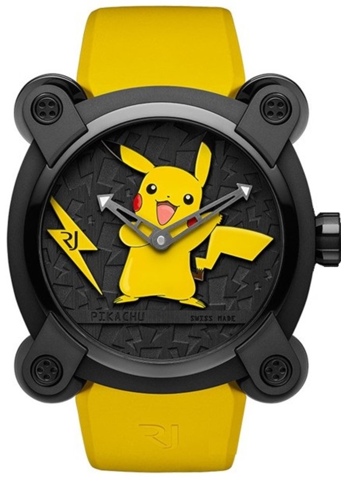 Особенности модели: аппликация Пикачу на циферблате, окрашенная вручную желтой холодной эмалью. Желтый вулканизированный резиновый ремешок - вкомплекте. Корпус зафиксирован интегрированными шарнирными соединениями. Модель представлена Romain Jerome, чтобы почтить 20-летний юбилей Pokémon. Часы выпущены совместно с The Pokémon Company International ограниченным тиражом из 20 экземпляров. На черном циферблате с DLC-покрытием нанесен гравированный рисунок молнии. С уникальной и узнаваемой формой сложный титановый корпус оснащен символическими шарнирными наконечниками RJ, интегрированными шарнирными соединениями, которые позволяют лучше регулировать запястье. Механизм с автоматическим подзаводом. Индикация часов и минут. Водонепроницаемость корпуса - 50 метров.