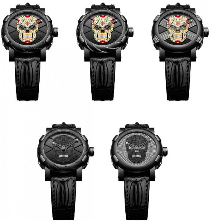 Модель Dia de los Muertos из коллекции Capsules, выпущенная в солидарность с мексиканской традицией отмечания Дня мертвых, впервые была представлена в 2012 году. Теперь же модель получила пять новых версий, отличающихся друг от друга декором корпусов и циферблатов. На последних все также остается неизменный символ Дня мертвых – калаверас – череп из сахара. Корпус новых Dia de los Muertos выполнен из нержавеющей стали с PVD-покрытием черного цвета. Диаметр его составляет 46 мм, коэффициент водонепроницаемости небольшой – часы выдерживают давление воды на глубине до 30 метров. Безель всех версий изготовлен из черной керамики. У одной из версий он гладкий, без декора (Референс RJ.T.AU.FM.001.06), у двух других инкрустирован белыми бриллиантами (Референс RJ.T.AU.FM.001.03, Референс RJ.T.AU.FM.001.05), еще у двух – черными сапфирами (Референс RJ.T.AU.FM.001.04, Референс RJ.T.AU.FM.001.07). Заднюю крышку часов украшает выгравированный медальон Dia de los Muertos. Полированный черный циферблат с выгравированной в форме «Х» символикой и накладным логотипом RJ украшен черным черепом в технике шамплеве (Референс RJ.T.AU.FM.001.03, Референс RJ.T.AU.FM.001.04) с инкрустацией белыми бриллиантами (Референс RJ.T.AU.FM.001.05) или черными сапфирами (Референс RJ.T.AU.FM.001.06, Референс RJ.T.AU.FM.001.07). Черные стрелки изготовлены из сатинированной нержавеющей стали, покрыты люминесцентным составом Superluminova C1 «blue emission» (излучают синий цвет). Часы укомплектованы автоматическим мануфактурным механизмом (Калибр RJ001-A) с функцией индикации часов и минут (23 камня, балансовая частота составляет 28 800 полуколебаний в час, 42-часовой запас хода). В продажу Dia de los Muer