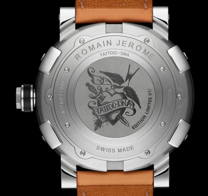 Новинка Tattoo-DNA оборудована швейцарским автоматическим калибром Romain Jerome RJ001-A, на 23 камнях, с частотой 28800 полуколебаний в час, 42-часовым запасом хода, функциями индикации часов и минут.