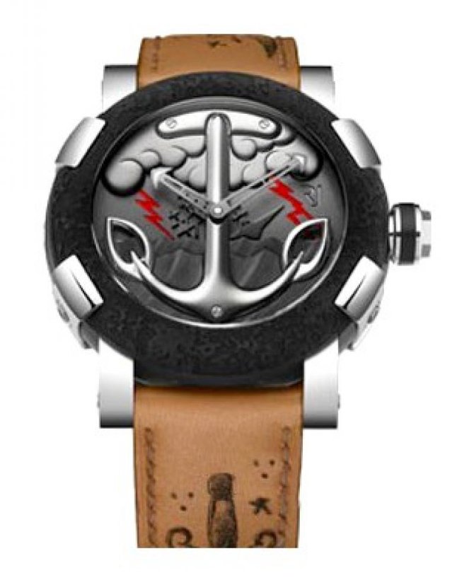 Трехмерный темно-серый циферблат защищен сапфировым стеклом. На переднем плане есть крупное накладное изображение якоря, а на заднем плане – тонущее в бурном море парусное судно, темные тучи и молнии. В центральной части циферблата размещены скелетонированные часовая и минутная стрелки, указатели которых покрыты люминесцентным веществом белого цвета.