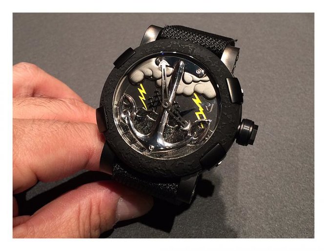 Трехмерный темно-серый циферблат защищен сапфировым стеклом. На переднем плане есть крупное накладное изображение якоря, а на заднем плане – тонущее в бурном море парусное судно, темные тучи и молнии. В центральной части циферблата размещены скелетонированные часовая и минутная стрелки, указатели которых покрыты люминесцентным веществом белого цвета.
