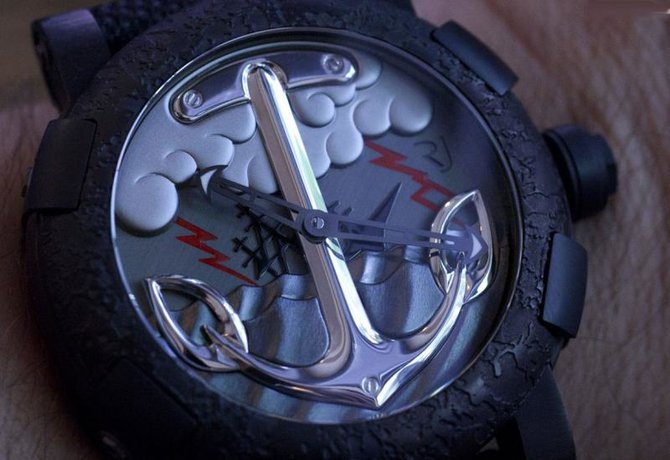 Трехмерный темно-серый циферблат защищен сапфировым стеклом. На переднем плане есть крупное накладное изображение якоря, а на заднем плане – тонущее в бурном море парусное судно, темные тучи и молнии. В центральной части циферблата размещены скелетонированные часовая и минутная стрелки, указатели которых покрыты люминесцентным веществом белого цвета.