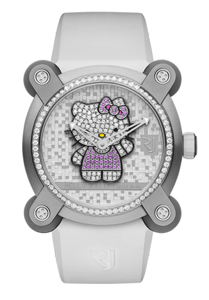 Модель Hello Kitty от Romain Jerome. Аппликация на циферблате выполнена с помощью установки на него бриллиантов и розовых сапфиров. Устройство оснащено защитными винтами и встроенными шарнирными соединениями для оптимальной регулировки запястья. Серебристый 3D-циферблат с пиксельными уровнями. Вторгаясь на женскую территорию, швейцарская часовая компания Romain Jerome объединила усилия с Sanrio и Maison, чтобы отдать дань персонажу японской поп-культуры - Hello Kitty, правящую поп-икону в середине 70-х годов. Для нового сотрудничества бренды нашли общий язык, подарив счастье и улыбки на лицах почитателей. Часы вошли в первую женскую коллекцию RJ. И сильная личность, созданная вокруг персонажа Hello Kitty, и неизменный узнаваемый дизайн делают модель особым символом для женщин всех возрастов. Стальной корпус, уникальный для моделей 40 мм, подчеркивает в Hello Kitty высокотехнологичный циферблат. Часы RJ X Hello Kitty работают на механическом механизме с автоподзаводом. Лимитированный тираж - 76 экземпляров.