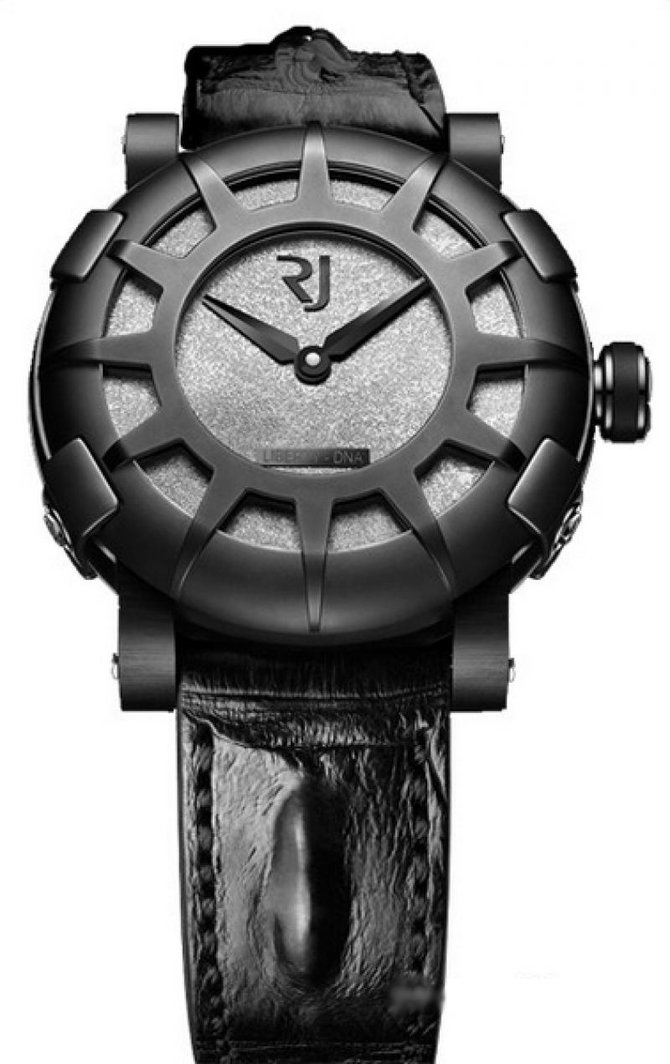 Liberty-DNA Black обладает 46-милимметровым корпусом из нержавеющей стали с вакуумным напылением, безель - из бронзы с тем же покрытием, а циферблат – из окисленной меди с серым лаком, чтобы соответствовать темному оформлению часов. Логотип RJ-Romain Jerome возле отметки в 12 часов идеально вписывается в стиль циферблата и модели в целом. Стрелки отполированы, обработаны пескоструем и затемнены. Ремешок часов сделан из черной кожи аллигатора.