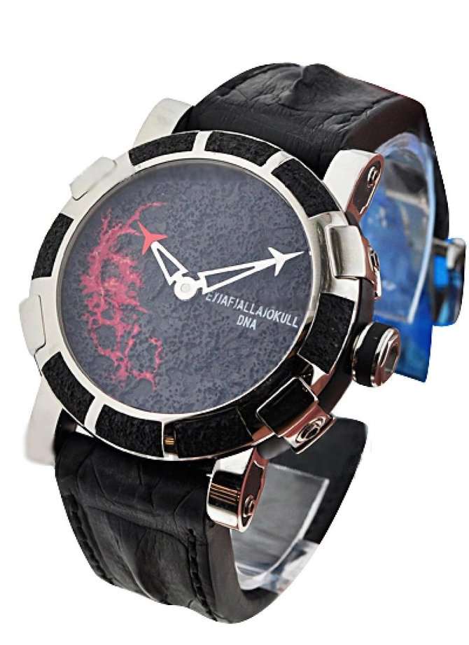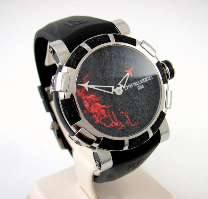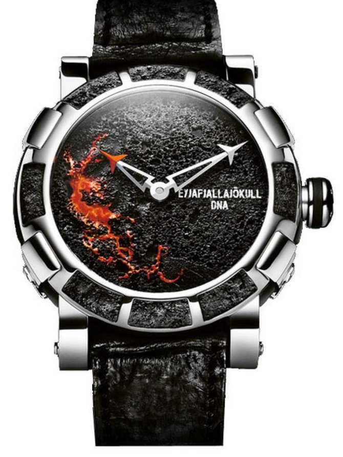 Компания Romain Jerome использует для своих часов самые необычные материалы. Сталь Титаника, фрагменты космического корабля Apollo 11, лунную пыль, а теперь еще и пепел вулкана Эйяфьяллайекюль (Eyjafjallajökull). Исландский вулкан Эйяфьяллайекюлль (Eyjafjallajokull) ещё не успел остыть, а предприимчивые европейцы ужe пытаются на нём заработать. Дизайнерское бюро Ромена Джерома (Romain Jerome) представила наручные часы под названием Eyjafjallajokull-DNA, корпус которых, как вы можете догадаться, содержит вставки вулканического камня с того самого вулкана. Дизайн часов как бы напоминает обо всех перипетиях недавнего события – о самом извержении вулкана и о связанной с ним повсеместной отмене авиаперелётов над Европой. Циферблат и ремень имитируют вулканическую породу, над которой беспокойно кружат стрелки-самолёты. Каждый экземпляр часов будет продаваться вместе с сертификатом, подтверждающим, что внутри находятся действительно вулканические камни из Исландии. Стоимость часов Eyjafjallajokull-DNA пока не называлась. Брутальный дизайн часов с использованием образов огня, лавы, пыли и ветра напоминает о неумолимости природы и уязвимости человека.