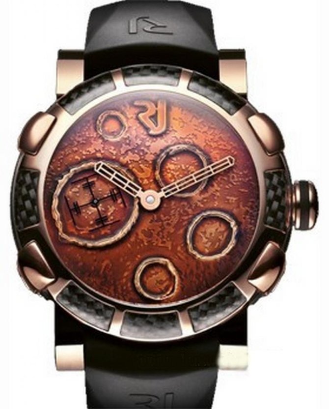 Часы из серии Moon-DNA несут в себе провокационные идеи и дизайн, так полюбившийся поклонникам стимпанка и космических приключений, которыми богаты коллекции Romain Jerome. Изготовленный вручную циферблат представляет собой скульптурное изображение поверхности Луны, а материал циферблата действительно содержит лунную пыль. Корпус выполнен из розового золота, а безель – из карбона. Какая бы то ни было разметка на циферблате отсутствует, часы и минуты указывают стрелки в виде солнечных батарей, а секунды отсчитывает вращающая модель космического шаттла. За функции часов, минут и секунд отвечает автоматический калибр Jacquet C22RJ51. Версия с циферблатом цвета охры.