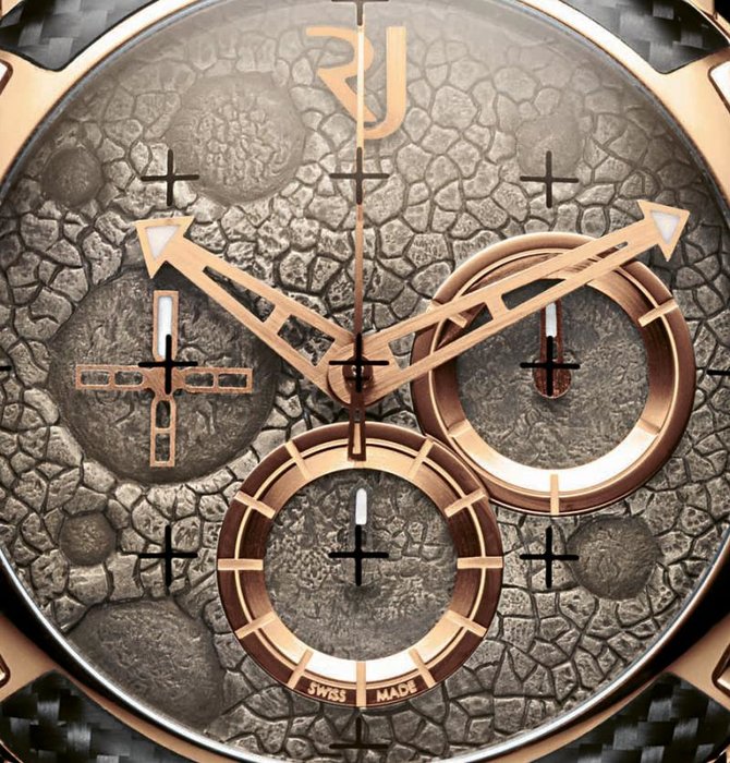 Корпус круглый, из нержавеющей стали, диаметром 46 мм, водонепроницаемый до 30 метров. Безель из углеродного волокна, обхваченный четырьмя ободками на 2, 4, 8 и 10 часах, выполненными из полированной нержавеющей стали, или из нержавеющей стали с черным PVD-покрытием, или из 18-каратного красного золота. Из этих-же материалов изготовлены дужки корпуса, заводная головка и хронографические кнопки. Сапфировое стекло с внутренним антибликовым покрытием защищает черный или серый циферблат, отделанный под лунную поверхность и покрытый лунной пылью. Циферблат без разметки, часовая и минутная стрелки скелетонизированные.