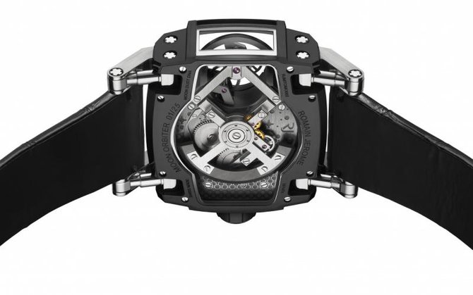 Часы оснащены автоматическим механизмом с парящим турбийоном. Циферблат часов и минут смещен на «3 часа», уравновешивая турбийон на «9 часов». Линейный индикатор резерва хода, который, к слову, составляет 42 ч, располагается на «6 часов» между ушками. Черный ремешок из кожи аллигатора оснащен классической пряжкой. Модель выпущена ограниченной серией в 25 экземпляров и является органическим продолжением коллекции Moon-DNA. Romain Jerome Moon Orbiter Speed Metal – очередной подарок поклонникам научной фантастики, уносящий их в глубокий космос, туда, куда пока еще не ступала нога человека.