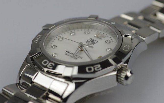 10 бриллиантов (0,1 карата) по периметру перламутрового циферблата. При изготовлении ювелирных часов TAG Heuer большое внимание уделяется индивидуальным характеристикам каждого камня: его размеру, цвету, прозрачности и весу. Прежде чем бриллиант будет вручную закреплен на поверхности корпуса в строгом соответствии с принятыми стандартами, его качество тщательно проверит геммолог, вооруженный бинокуляром. В свою очередь закрепщик следит за тем, чтобы все бриллианты были идентичными по размеру, а площадка и рундист (пояс перпендикулярных площадке граней) каждого камня - строго параллельными. Следование этим принципам гарантирует качество и утонченность отделки и позволяет подобрать идеально подходящие друг другу камни. Затем бриллианты закрепляются на поверхности из золота или стали при помощи крапанов. В рамках контроля качества все ювелирные модели TAG Heuer подвергаются жестким тестам. Их погружают в мыльный раствор и при помощи ультразвука проверяют прочность закрепки.