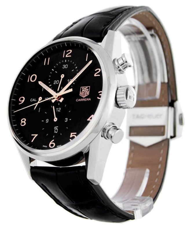 Счетчики хронографа с круговым узором в положениях "12 часов" и "6 часов". Полированные рельефные арабские цифры цвета розового золота. Полированный рельефный логотип TAG Heuer и надпись “CARRERA” цвета розового золота.