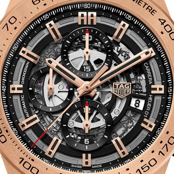 Круглый часовой корпус модели TAG Heuer Carrera Calibre Heuer 01 Automatic Chronograph 45mm произведен из 18-каратного розового золота. Основные функции данных часов - индикация часов, минут, секунд, даты и хронографа. Индикация осуществляется на скелетонизированном циферблате, защищенном сапфировым стеклом. За выполнение функций отвечает мануфактурный автоматический калибр Heuer 01 с запасом хода в 50 часов. На золотой безель нанесена тахиметрическая шкала. Ремешок черного цвета выполнен из каучука, а застежка к нему - из золота. Корпус с герметичностью в 100 метров. Пушеры хронографа размещены вокруг заводной головки. Заводная головка покрыта каучуковой вставкой, чтобы исключить скольжение во время использования. Основные символы часов покрыты люминесцентным составом, светящимся в темноте.