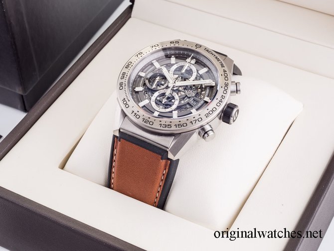 Модель швейцарских часов Tag Heuer Carrera Caliber Heuer 01 Skeleton 45mm Mens Watch выполнена в круглом корпусе из матового титана. Циферблат-скелетон накрыт стеклом из сапфира. На безель нанесена тахиметрическая шкала. Из функций стоит отметить индикацию часов, минут, секунд, даты; наличие функции хронографа. Часовые метки со стрелками покрыты люминесцентным составом. Заводной ключ с каучуковой вставкой. Пушеры хронографа расположены вокруг заводной головки. Ремешок пошит из натуральной кожи теленка в коричневом цвете. Герметичность - 100 метров. Диаметр корпуса часов - 45 мм, толщина - 16.5 мм. Механизм с автоматическим подзаводом.