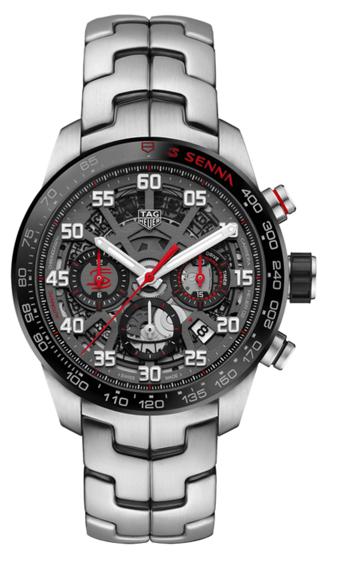 Водостойкие наручные часы от марки из Швейцарии TAG Heuer, модель Carrera Calibre Heuer 02 Senna Edition, были выпущены в корпусе из нержавеющей стали, диаметром 43 мм. Корпус отличается высокой водонепроницаемостью - до 100 метров. Часы работают на базе установленного автоматического механизма с высоким запасом хода - 80 часов. Кроме того, механизм отличается наличием функции хронографа. На сером скелетированном циферблате индицируются часы, минуты, секунды, дата, на фланец нанесена тахиметрическая шкала, счетчики хронографа. Часы укомплектованы браслетом из нержавеющей стали и раскладной пряжкой.