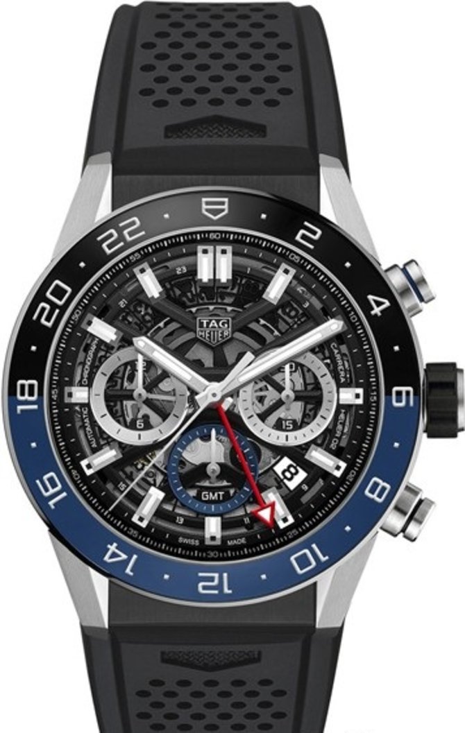 Часовой бренд TAG Heuer представляет швейцарские часы Heuer 02 GMT Chronograph CBG2A1Z.FT6157, что пополнили коллекцию Carrera. Корпус из керамики и нержавеющей стали выполнен в диаметре 45 мм. На уникальном скелетонированном циферблате показываются часы, минуты, секунды, дата, показания хронографа, второе время. Механизм с автоматическим подзаводом Heuer 02 оснащен запасом хода на 75 часов. Этот механизм был создан собственными силами мануфактурой TAG Heuer. Ремешок из каучука черного цвета укомплектован классической застежкой. Стрелки и метки созданы из стали и покрыты люминесцентным составом. Циферблат защищен высокопрочным сапфировым стеклом.