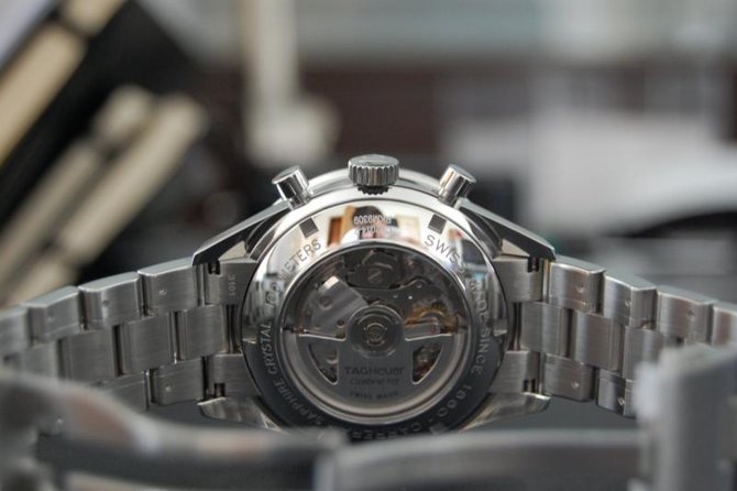 Тахиметрическая шкала на безеле для замеров средней скорости передвижения. Тахометрическая шкала позволяет вычислять среднюю скорость движения (например, автомобиля) путем измерения времени, затраченного на прохождение фиксированной дистанции (один километр или одна миля). Три счетчика: счетчик безостановочной секундной стрелки, минутный и часовой счетчики хронографа. Автоматический механизм хронографа. Автоматические хронографы TAG Heuer способны измерять отрезки времени продолжительностью до 12 часов с точностью до 1/8 секунды. Они оснащены швейцарскими механизмами с высокой частотой колебаний баланса и представляют собой одно из ярких достижений в истории часового дела и компании TAG Heuer.
