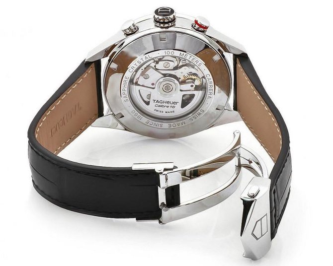 Энергичный мужественный хронограф Carrera Calibre 16 Day Date Automatic Chronograph, пришедший из мира автоспорта. К функции хронографа с классическими счетчиками часов и минут добавилась индикация даты и дня недели - в сдвоенной апертуре у отметки "3 часа". На непроницаемо-черном циферблате стильно смотрятся агрессивные красные цветовые акценты. Эргономичный стальной корпус с черным безелем, на который нанесена тахиметрическая шкала, помещен на ремешок из кожи аллигатора. Работу автоматического калибра Calibre 16 можно наблюдать через прозрачную заднюю крышку.