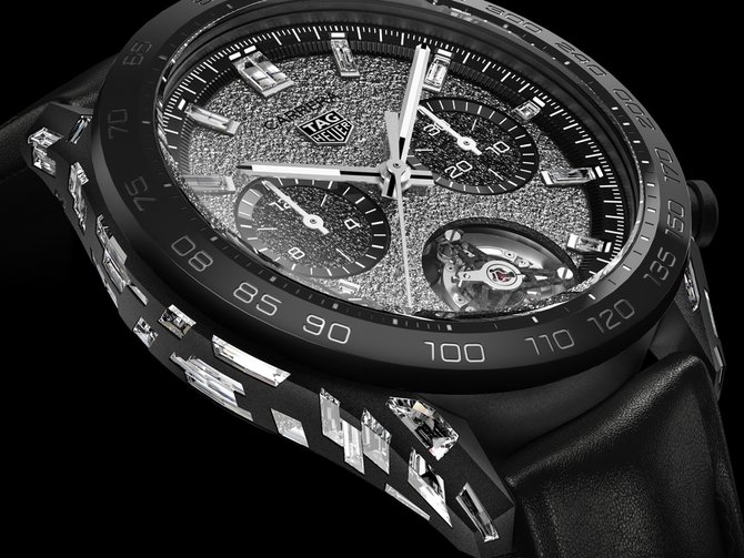 Спустя 10 лет, вернулись часы TAG Heuer, которые были одним из основных продуктов большего каталога продукции бренда. Несколько лет назад TAG Heuer начали сворачивать разработку своих сложных механических часов высокого класса и сосредоточились на более востребованных продуктах и моделях. TAG Heuer представляет новую версию часов с турбионом, рассказывающим об инновационных материалах и современных формах мужских украшений в этих единственных в своем роде часах. Эти уникальные часы изготовлены из керамики, алюминия и украшены бриллиантами. Корпус из керамики, диаметром 44 мм. Защитное стекло из сапфира с антибликовым покрытием. Калибр Heuer 02T с автоподзаводом, запасом хода на 65 часов и функциями: часы, минуты, секунды, хронограф, турбийон. Ремень из кожи теленка - в комплекте.