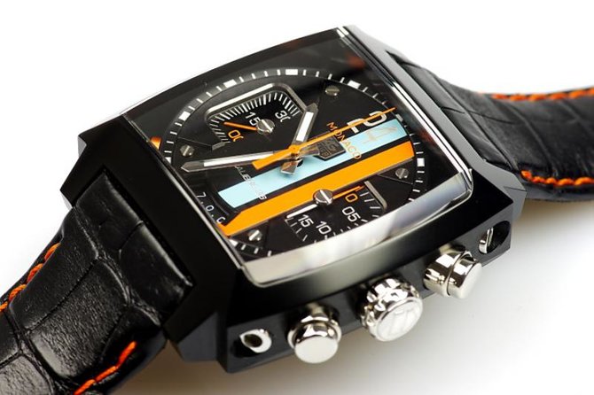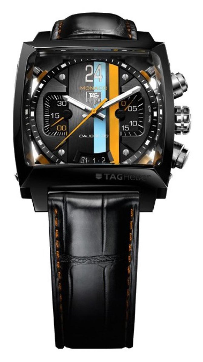 Циферблат новинки имеет все характерные признаки этой гоночной коллекции – вертикальные полосы на циферблате напоминают о предыдущих моделях и гоночном автомобиле Gulf Porsche 917K, под управлением Стива Маккуина (Steve McQueen), в честь которого они были выпущены. Сам же циферблат теперь стал объемным, многоуровневым. Сапфировые стекла с фронтальной и тыльной стороны призматические с антибликовой обработкой. Сквозь них отлично видно не только циферблат и «топовый» Calibre 36 , но и держащих механизм 4 «руки» Системы Динамического Поглощения Представленная на прошлогоднем BaselWorld, модель Monaco Twenty Four Calibre 36 Chronograph наконец поступила в продажу. Циферблат новинки имеет все характерные признаки этой гоночной коллекции – вертикальные полосы на циферблате напоминают о предыдущих моделях и гоночном автомобиле Gulf Porsche 917K, под управлением Стива Маккуина (Steve McQueen), в честь которого они были выпущены. Сам же циферблат теперь стал объемным, многоуровневым. Сапфировые стекла с фронтальной и тыльной стороны призматические с антибликовой обработкой. Сквозь них отлично видно не только циферблат и «топовый» Calibre 36 , но и держащих механизм 4 «руки» Системы Динамического Поглощения изготовленной из полимеров используемых в самолетостроении и при создании болидов Formule 1. Собственно эта система, защищающая механизм от вибраций от 1 до 10 Герц, является изюминкой новой модели. Корпус 40,5 мм в поперечнике имеет карбид-титановое черного цвета. Механизм автоматический – заслуженный Calibre 36 (базовый калибр Zenith El Primero 400), с фирменными 36 000 пк/час, 31 камень, хронометр C.O.S.C., «лишился» 12-часового индикатора хронографа в пользу расширенной апертуры даты на «6 часах». Ротор автоподзавода персонализирован для модели в соответствии с гоночной тематикой.