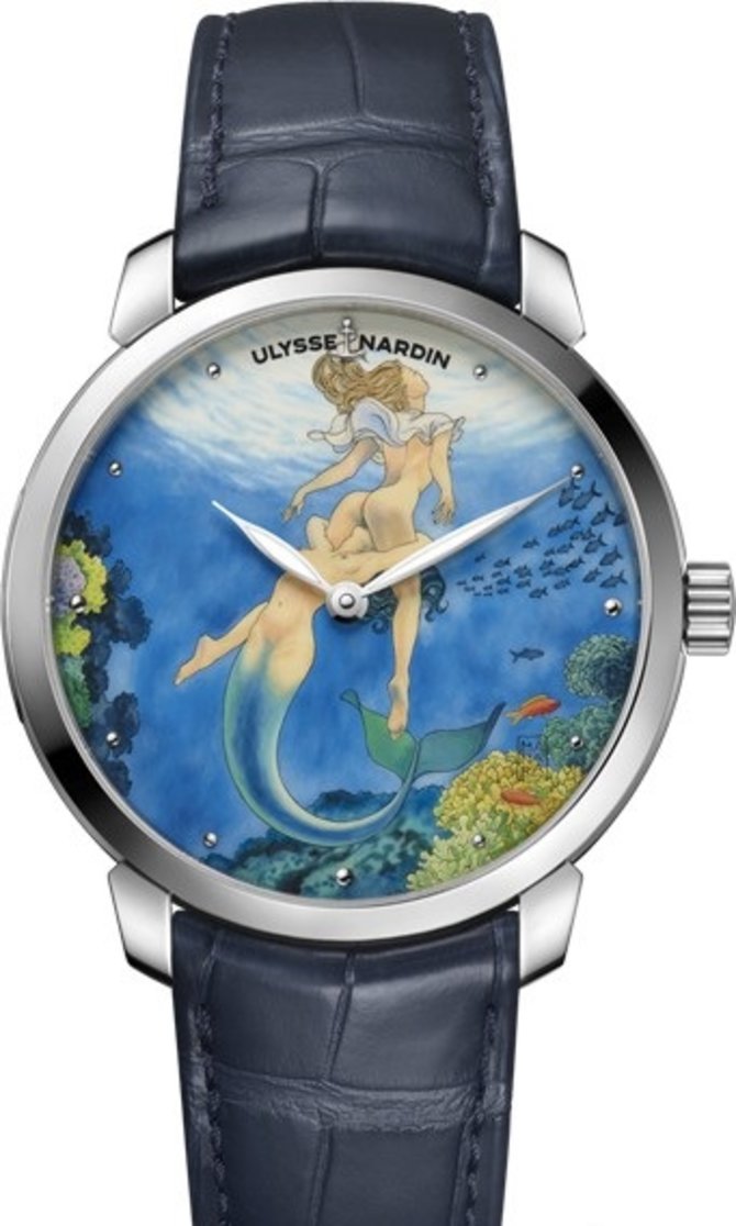 Мужская модель наручных швейцарских часов Classic Manara 3203-136LE-2/MANARA.06 от швейцарской часовой мануфактуры Ulysse Nardin имеет эмалированный циферлат с художественным оформлением - нанесением рисунка итальянского художника Мило Манары. Корпус из полированной нержавеющей стали выполнен в диаметре 40 мм. Часы работают на базе мануфактурного механического калибра UN-320 с автоматическим подзаводом. На художественном циферблате индицируется текущее время стрелками из стали с покрытием люминесцентным составом. Часы выпущены лимитированной серией - 10 экземпляров на весь мир.