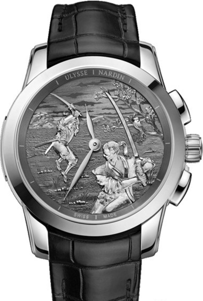 Производство швейцарских часов с репетиром - это особая строка в истории часовой марки Ulysse Nardin. В этих часах фигурки на циферблате движутся в такт с боем часов. Платиновый корпус, диаметром 43 мм, хранит в себе мануфактурный часовой калибр UN-610 с запасом хода на 42 часа. На задней части корпуса установлена прозрачная задняя крышка из сапфирового стекла с антибликовым покрытием сверху, через которую видна работа механизма. Корпус герметичен до 30 метров. Платиновая версия часов выпущена ограниченной серией в 18 экземпляров.