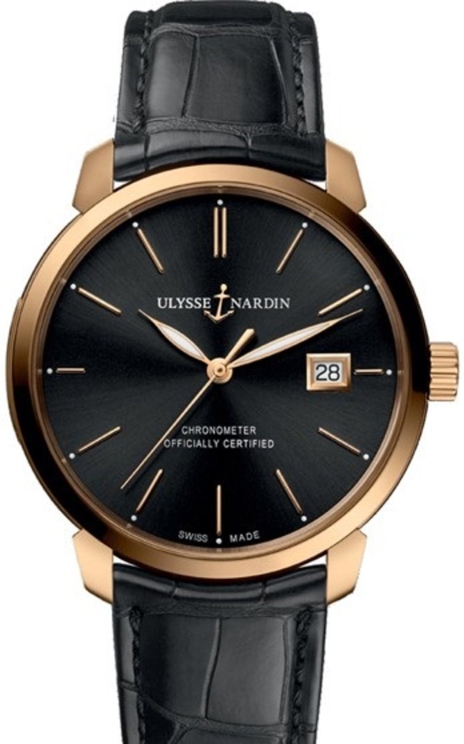 Классические часы в золотом круглом корпусе выпущены маркой Ulysse Nardin с установленным механическим калибром UN-815, работающим от автоматического подзавода. Часы имеют официальный статус сверхточного хронометра. Диаметр корпуса - 40 мм. На черном циферблате контрастно выделяются золотые метки и стрелки. К слову, стрелки покрыты люминесцентным составом для индикации времени в темноте. Индикация, что осуществляется на циферблате: часы, минуты, секунды, дата. На руке часы фиксируются натуральным ремешком из кожи аллигатора и застежкой из чистого золота. Запас хода на 42 часа. Водостойкость - 50 метров.