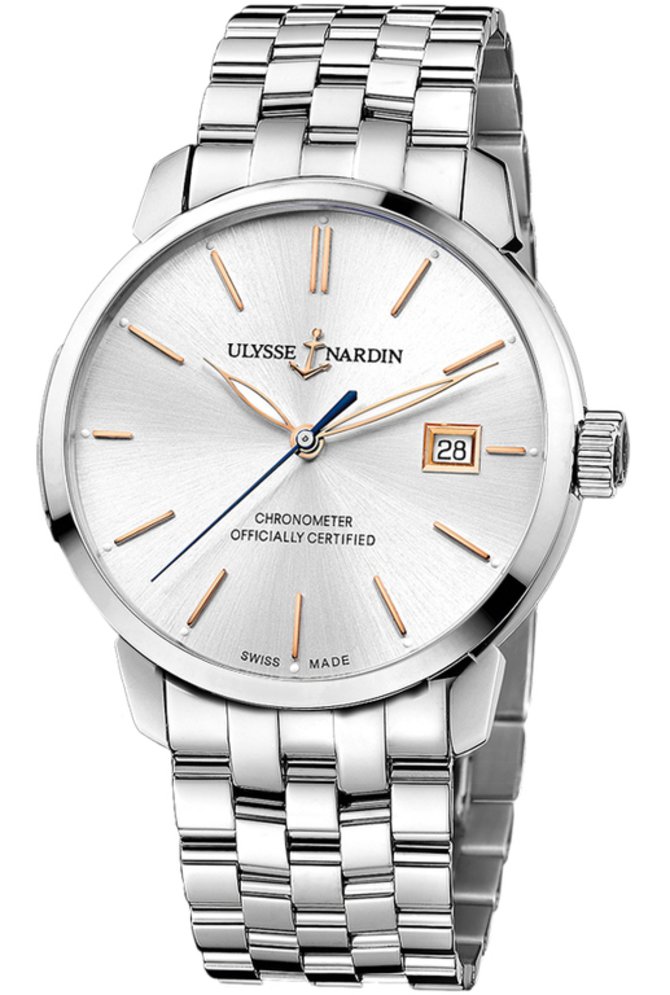 Модель часов Classico от швейцарской компании Ulysse Nardin полностью соответствует своему названию и выполнена в строго классическом стиле. Часы получили механизм с автоподзаводом, который полностью разработан и собран в стенах мануфактуры Ulysse Nardin. В деталях механизма использован кремний, что позволило улучшить показатели точности хода и увеличить срок эксплуатации деталей. Защищен часовой механизм водостойким корпусом из нержавеющей стали. Задняя крышка корпуса выполнена из сапфирового стекла, что дает возможность наблюдать за работой механизма. На серебристом циферблате хронометра размещены часовая, минутная и секундная стрелки, окошко с указанием даты. Центральные стрелки и часовые индексы изготовлены из 18-каратного розового золота. Дизайн циферблата сдержанный и элегантный. Модель комплектуется удобным пятирядным браслетом из нержавеющей стали с раскладывающейся пряжкой.