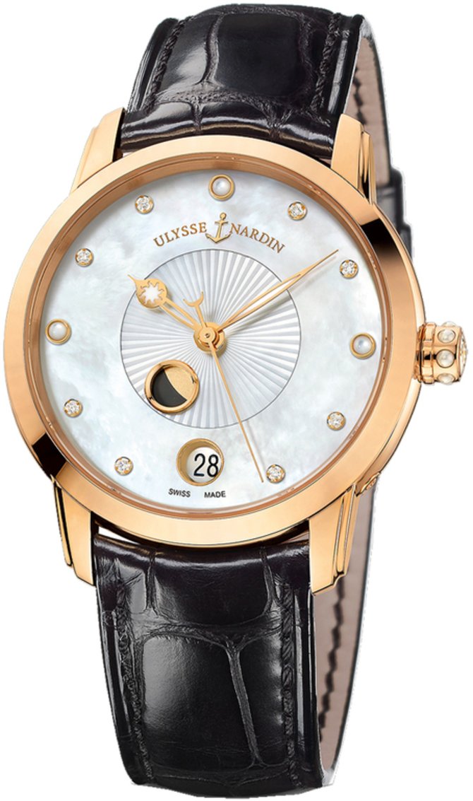 В этой версии часов Ulysse Nardin установлен совершенный швейцарский механизм, имеющий официальный сертификат COSC и функционирующий от автоподзавода. Корпус модели изготовлен из розового золота. Для декориции заводной головки и циферблата применялись драгоценные камни. Диаметр корпуса представленных женских швейцарских часов - 35 мм. Индикация: часы, минуты, секунды, дата, фазы Луны. Перламутровый циферблат защищает сапфировое стекло. Ремешок пошит из крокодильей кожи. Застежка раскладная, из золота. Корпус с 50-метровой герметичностью.