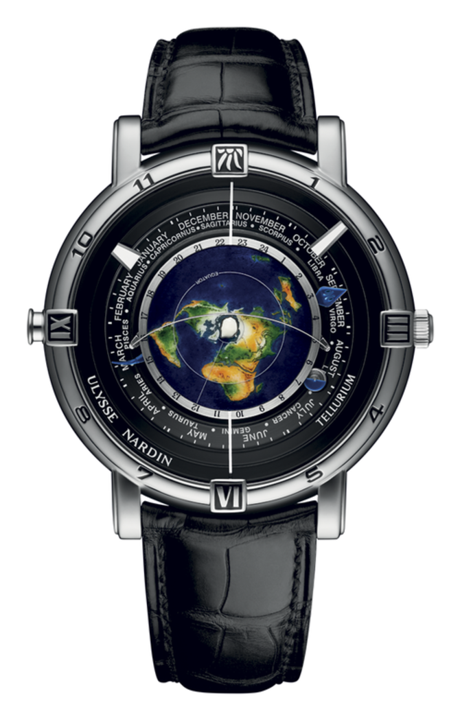 Ulysse Nardin Trilogy - это механические многофункциональные астрономические часы, выпущенные легендарной часовой компанией в корпусе из платины, диаметром 43 миллиметра. Функции часов: часы, минуты, месяц, знак зодиака, место и время восхода и захода Солнца, солнечное и лунное затмение, вращающаяся вокруг Земли Луна, вращающаяся Земля с точки Северного полюса. За выполнение такого серьезного часового набора отвечает мануфактурный швейцарский калибр UN-88 от Ulysse Nardin с автоподзаводом вечного действия. Герметичность часового корпуса - 30 метров. Сапфировое стекло защищает циферблат. Ремешок из крокодильей кожи и раскладная платиновая застежка дополняют представленную модель. Часы выпущены ограниченной серией - 100 экземпляров.