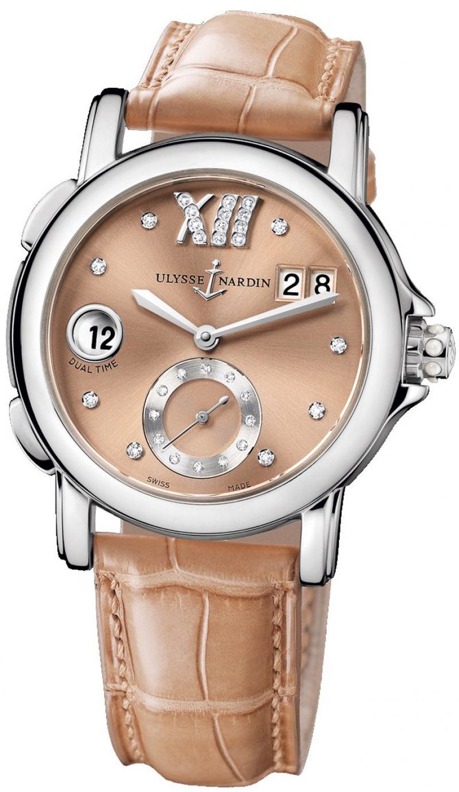 Механизм автоматический, Калибр UN-22 с запасом хода 42 часа. Корпус из нержавеющей стали, диаметром 37мм. Циферблат - коричневый, римская цифра "12" выложена бриллиантами. Стекло - сапфировое. Водонепроницаемость - 100 метров. Ремешок из кожи крокодила коричневого цвета, раскладывающаяся застежка. Уникальный механизм быстрой коррекции часового пояса, индикатор «домашнего» времени, большой указатель даты. Фиксируемая на резьбе заводная головка.