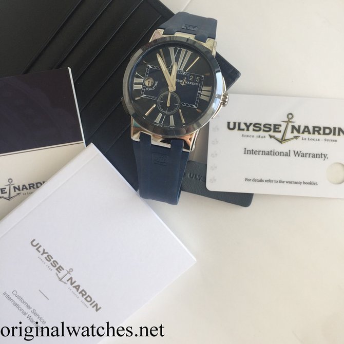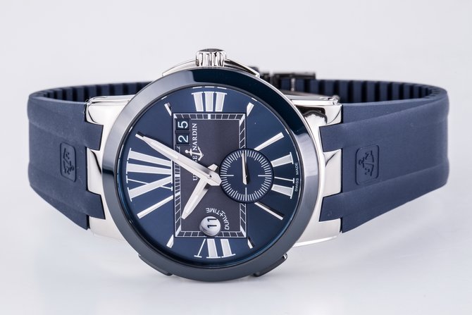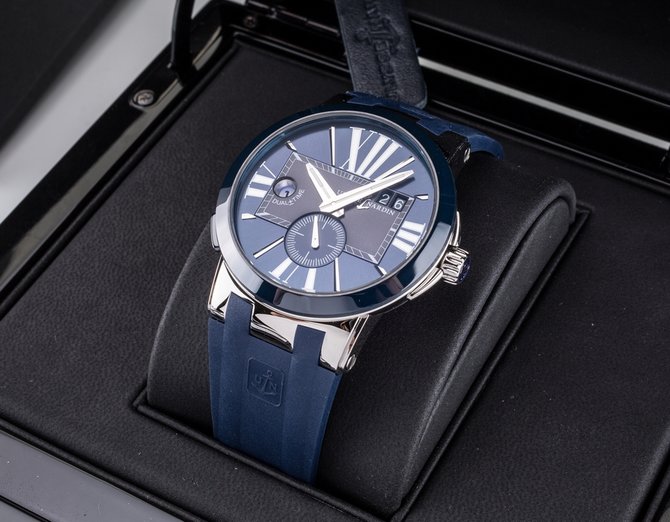 Бренд Ulysse Nardin создал новые часы серии Executive Dual Time. Обращая на название, он намекнул, что эти часы нацелены на деловых людей. Часы производятся из высококачественной стали. Безель выполнен из керамики. Механизм автоматический, Калибр UN-24, имеет запас хода 42 часа. Функции: часы, минуты, секунды, увеличенная дата. Циферблат синего цвета. Ремешок каучуковый, синего цвета, отлично сидят на запястье, раскладная застежка. Водонепроницаемость 100 м. Уникальный механизм быстрой коррекции времени, индикатор постоянного «домашнего» времени, большой указатель даты. Фиксируемая на резьбе заводная головка. Уникальный механизм быстрой коррекции времени. Индикатор «домашнего» времени, большой указатель даты, секундная стрелка на дополнительном циферблате.