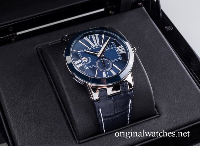 Бренд Ulysse Nardin создал новые часы серии Executive Dual Time. Обращая на название, он намекнул, что эти часы нацелены на деловых людей. Часы производятся из высококачественной стали. Безель выполнен из керамики. Механизм автоматический, Калибр UN-24, имеет запас хода 42 часа. Функции: часы, минуты, секунды, увеличенная дата. Циферблат синего цвета. Ремешок из кожи крокодила, синего цвета, отлично сидят на запястье, раскладная застежка. Водонепроницаемость 100 м. Уникальный механизм быстрой коррекции времени, индикатор постоянного «домашнего» времени, большой указатель даты. Фиксируемая на резьбе заводная головка. Уникальный механизм быстрой коррекции времени. Индикатор «домашнего» времени, большой указатель даты, секундная стрелка на дополнительном циферблате.