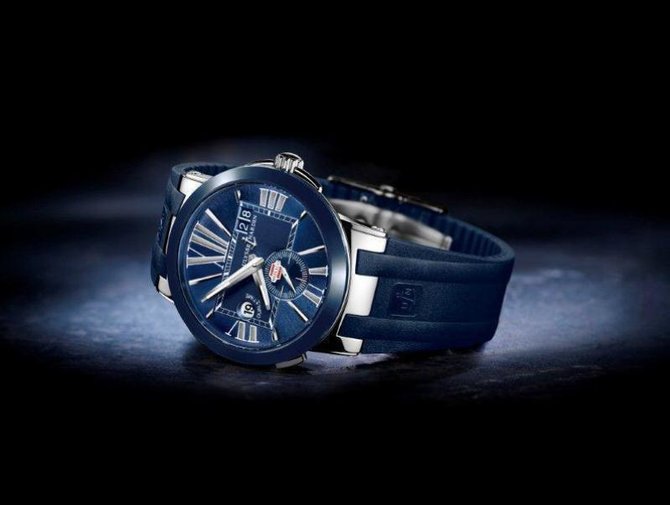 В отличие от прошлогодней модели, доминирующий цвет новинки – синий. На ярко-синем циферблате выделяются стальные крупные римские цифры и центральные стрелки, на 6 часах расположен боковой секундный циферблат, у отметки 2 часа двойная апертура даты. Время во втором часовм поясе отображается в маленькой апертуре на 9 часах.