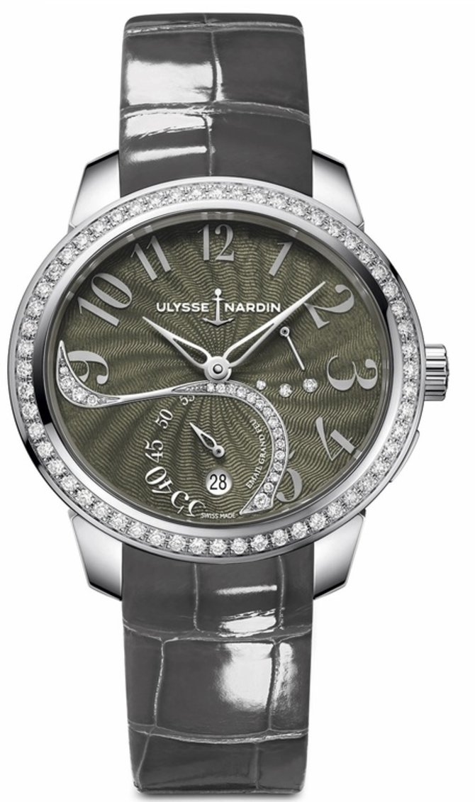 Замечательная модель женских швейцарских часов от компании Ulysse Nardin на механическом калибре UN-310 с автоматическим подзаводом, который успешно помещен в корпус из нержавеющей стали с инкрустацией драгоценными камнями - бриллиантами классической огранки белого цвета. На циферблате часов, гильошированном вручную мастером компании, также присутствуют белые бриллианты. Механизм с 48-часовым запасом хода отвечает за индикацию таких данных: часы, минуты, секунды, дата, запас хода. Кожа аллигатора послужила материалом для производства ремешка. Застежка из стали. Диаметр овального корпуса - 36 х 39 мм. Стекло сапфировое.