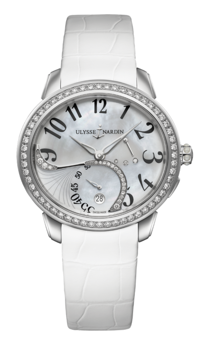 Перед Вашими глазами ювелирная модель женских швейцарских часов от популярной часовой компании Ulysse Nardin, вошедшая в коллекцию "Jade". Корпус элегантных часов выполнен из нержавеющей стали. Безель инкрустирован белыми бриллиантами. Циферблат, на котором указываются часы, минуты, секунды, дата и запас хода, также декорирован бриллиантами и закрыт прочным сапфировым стеклом с антибликовым покрытием. В часах стоит мануфактурный механизм UN-310 от Ulysse Nardin, работающий от автоматического подзавода. Запас хода механизма - двое суток. Женские ювелирные часы укомплектованы ремешком из кожи крокодила с классической пряжкой из стали. Диаметр корпуса: 36 х 39 мм. Водостойкость - до 30 метров. Модели Jade Automatic рекомендованы брендом Ulysse Nardin в качестве подарка для возлюбленных на любые знаменательные даты.