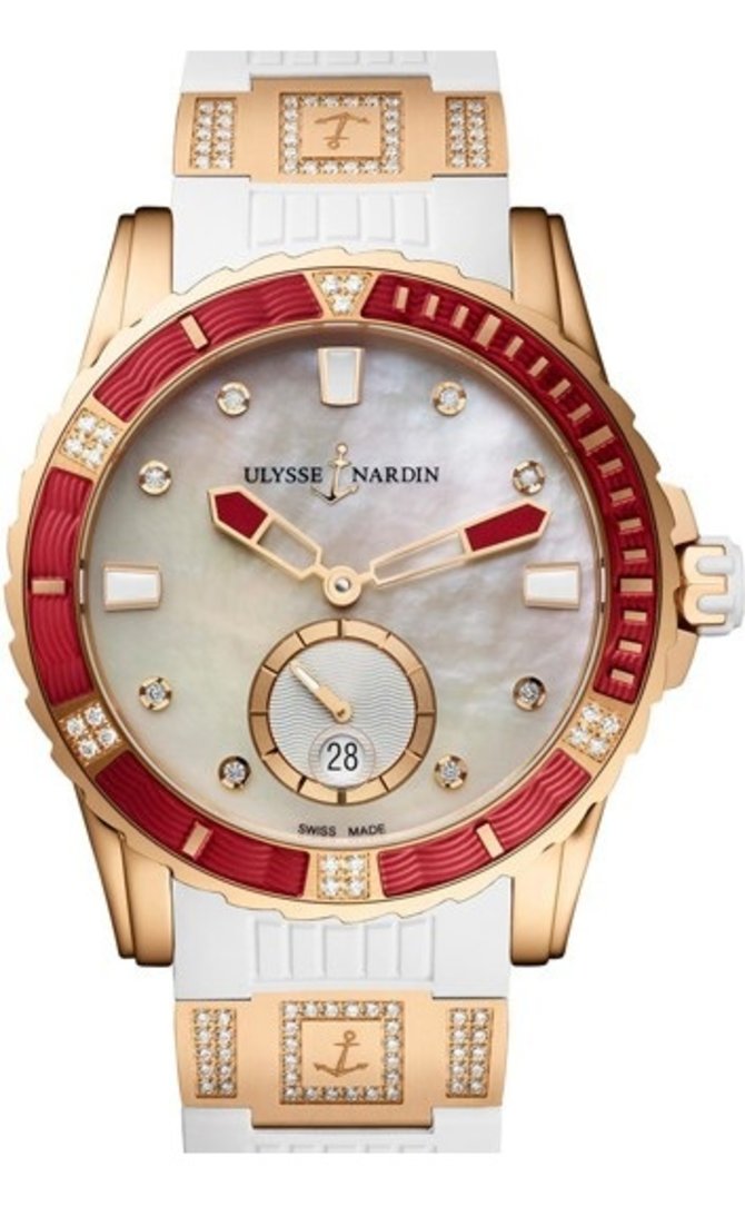 Женская дайверская часовая коллекция "Diver Lady" от Ulysse Nardin стала шире на одну модель шикарных наручных часов с 300-метрвой герметичностью корпуса. Корпус изготовлен из розового золота и украшен бриллиантами. Браслет выполнен из каучука. На нем размещены три золотых вставки. Одна из них - классическая застежка, а две оставшиеся служат для ношения почетного брендового логотипа Ulysse Nardin с инкрустацией бриллиантами. В часах установлен автоматический мануфактурный калибр UN-UN-320 с официальным сертификатом хронометра, выданным COSC. На перламутровом циферблате с бриллиантами, сквозь сапфировое защитное стекло, указываются: часы, минуты, секунды и дата. Индикатор даты накрыт увеличивающей линзой.