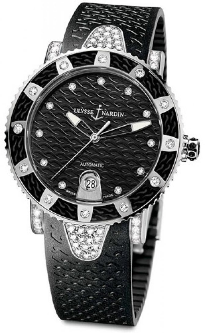 Одни женщины следуют моде, другие – её создают. Стиль fusion постепенно проникает в самые различные сферы городской жизни. Еда, музыка, интерьеры – все сегодня подчиняется законам абсурда. Однако совмещать несовместимое учатся не только знаменитые рестораторы и архитекторы, но и… часовые мастера. Ulysse Nardin представляет часы Lady Diver, сочетающие в себе безупречный дизайн и практичность. Спортивные и утонченные одновременно, Lady Diver не боятся глубоких погружений – им не страшны ни тихоокеанские воды, ни городские дожди, ни даже мировые наводнения. Практичность модели ничуть не уступает ее изяществу – Lady Diver легко превращаются из пляжного аксессуара в стильное украшение. Так что вы можете надеть их на работу или в спортивный зал, взять с собой в шикарный ресторан или на романтическую прогулку. К несомненным достоинством модели можно причислить практически невидимый автоматический подзавод. Корпус модели выполнен из нержавеющей стали, диаметром 40мм. инкрустирован белыми бриллиантами. Механизм автоматический, калибр UN-810 и виден через прозрачную заднюю крышку корпуса. Циферблат - черного цвета, инкрустирован 11 белыми бриллиантами. Ремешок каучуковый, черного цвета с раскладной застежкой. Lady Diver, собранные вручную, созданы для тех женщин, которые ценят стиль, качество и комфорт.