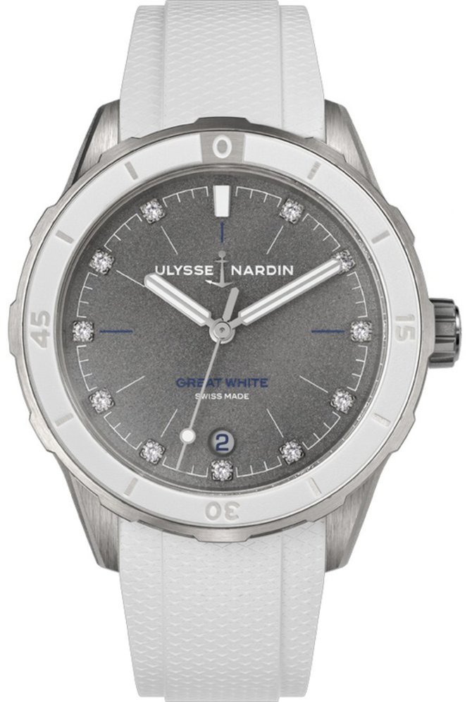 Швейцарские женские часы для дайвинга Diver Lady 8163-182LE-3/11-GW 39 mm представлены компанией ULYSSE NARDIN в 2019 году. Автоматический швейцарский мануфактурный калибр UN-816 заключен в стальной круглый корпус, диаметром 39 миллиметров. Механизм гарантирует индикацию таких данных: часы, минуты, секунды, дата. Уровень запаса хода механизма рассчитан на 2 суток. Герметичность корпуса соответствует критериям дайверских часов - 300 метров (30 атм). Безель корпуса вращается в одном направлении. Индикатор даты размещен в области отметки 6 часов. Каучуковый ремешок белого цвета поставляется с классической стальной застежкой. Стекло, установленное для защиты циферблата, выполнено из натурального сапфирового кристалла. Часовая разметка модели представлена из белых бриллиантов, на которые показывают стрелки с люминесцентным составом сверху для считывания показаний в темноте или под водой.