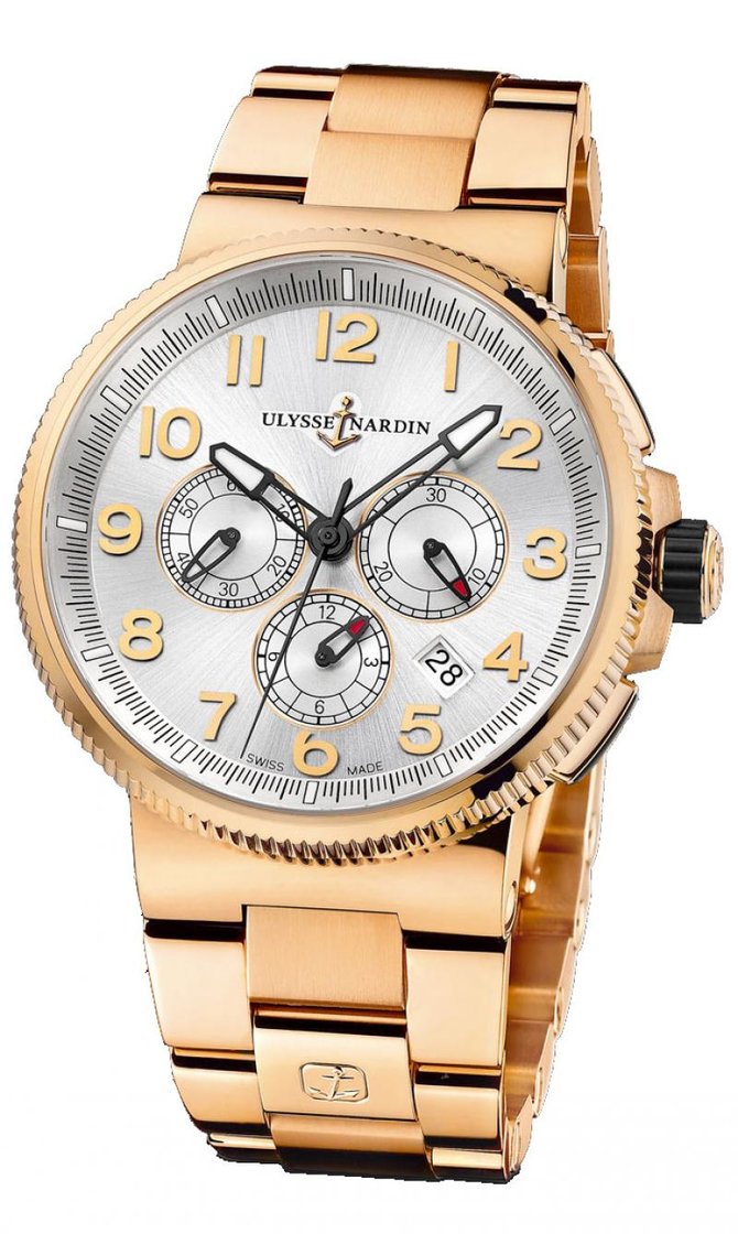 Новая модель Marine Chronograph Manufacture от швейцарского часового бренда Ulysse Nardin была представлена на международной часовой выставке Baselworld-2013. Новинка имеет круглый корпус из 18 каратного розового золота, диаметром 43 мм, водонепроницаемый до 100 метров. На торце рифленой завинчивающейся заводной головки, расположенной на 3 часах, имеется эмблема бренда Ulysse Nardin. Пушеры хронографа размещены на 2 и 4 часах. Сапфировое стекло установлено на передней стороне корпуса (выпуклое, с антибликовым покрытием) и на его завинчивающейся задней крышке. Циферблат эмалевый (выполненный по технологии Grand Feu, черного, белого или синего цвета, с римскими цифрами, часовой и минутной стрелками, покрытыми люминесцентным составом белого цвета. Модель оснащена мануфактурным швейцарским автоматическим коаксиальным механизмом Ulysee-Nardin UN150, состоящим из 322 деталей, с кремниевым спуском, балансовой частотой 28800 полуколебаний в час (4 гц), 48-часовым запасом хода. Циферблат - серебристого цвета. Браслет из розового золота 18К.
