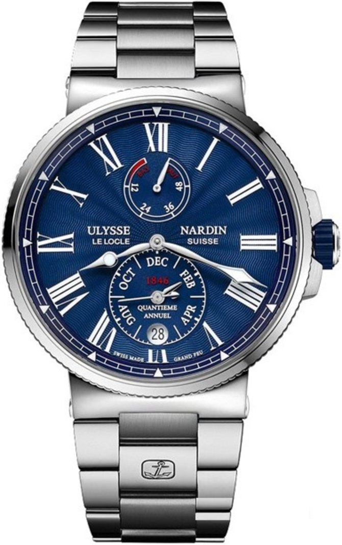 Новая модель многофункциональных механических часов от легендарных Ulysse Nardin. Модель носит название Marine Annual Calendar Chronometer. Из названия понятно, что часы обладают годовым календарем и статусом сверхточного хронометра. В часах установлен калибр UN-113, который функционирует от ротора автоматического подзавода. Уровень запаса хода механизма - 60 часов. Корпус швейцарских часов изготовлен из полированной нержавеющей стали, массивный дизайн которых дополнен стальным браслетом и раскладывающейся пряжкой. Синий циферблат гильоширован вручную морской строкой. Заводная головка покрыта каучуковой вставкой, что полностью исключает скольжение пальцев. Модель имеет повышенную водонепроницаемость - 100 метров.