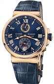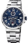 Новинка 2013 года Ulysse Nardin Marine Chronometer Manufacture 43mm. Независимая мануфактура Ulysse Nardin объединяет искусство и точность. Эмаль и калибр UN-118. В конце 19 века компания Ulysse Nardin производила судовые хронометры, помогающие капитанам кораблей, везущим ценные грузы, бороздить морские просторы, не сбиваясь с точного курса. Впервые представленный широкой публике в 2011 году и превзошедший всех конкурентов калибр UN-118 приводит в действие искусно созданный механизм хронометров Marine ChronometerManufacture из коллекции 2012 года. Мануфактурный механизм. Официальный сертификат хронометра. Индикатор запаса хода. Секундная стрелка увеличенного размера. Фиксируемая на резьбе заводная головка. Детали механизма выполнены с применением кремниевой технологии. Корпус выполнен из стали и титана. Циферблат - белый, лакированный, с римскими цифрами. Ремешок каучуковый, синего цвета с титановой вставкой и раскладной застежкой.