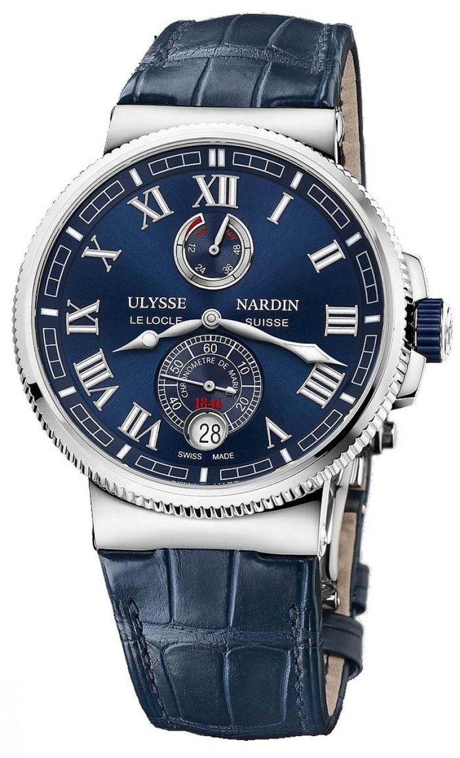Новинка 2013 года Ulysse Nardin Marine Chronometer Manufacture 43mm. Независимая мануфактура Ulysse Nardin объединяет искусство и точность. Эмаль и калибр UN-118. В конце 19 века компания Ulysse Nardin производила судовые хронометры, помогающие капитанам кораблей, везущим ценные грузы, бороздить морские просторы, не сбиваясь с точного курса. Впервые представленный широкой публике в 2011 году и превзошедший всех конкурентов калибр UN-118 приводит в действие искусно созданный механизм хронометров Marine ChronometerManufacture из коллекции 2012 года. Мануфактурный механизм. Официальный сертификат хронометра. Индикатор запаса хода. Секундная стрелка увеличенного размера. Фиксируемая на резьбе заводная головка. Детали механизма выполнены с применением кремниевой технологии. Корпус выполнен из стали и титана. Циферблат - синего цвета, с римскими цифрами. ремешок из кожи крокодила, синего цвета с раскладной застежкой.