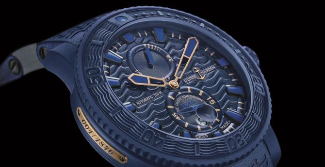Новинка 2015 года. Морской хронометр Marine Blue Ocean, от компании Ulysse Nardin, выпущен лимитированной серией из 1846 экземпляров. Об этом свидетельствует золотая пластина сбоку корпуса. Там же и выгравирован индивидуальный номер модели. На Калибр UN-26 с автоматическим подзаводом открывает вид задняя крышка из сапфирового стекла. Корпус из нержавеющей стали и каучука герметичен до уровня 200-метровой глубины. Модель комплектуется каучуковым ремешком синего цвета с фирменными вставками, на которых написаны название бренда "Ulysse Nardin" и напоминание об ограниченной серии часов "Limited Edition". Браслет наделен керамической раскладывающейся застежкой. Механизм обладает официальным сертификатом хронометра C.O.S.C. На синем гильошированном циферблате указываются: часы, минуты, секунды, дата и уровень запас хода механизма, который составляет 42 часа. Диаметр корпуса - 45.8 миллиметров.