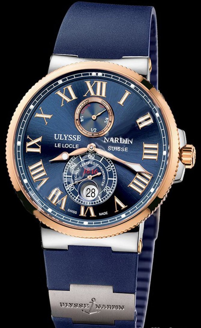 Новинка от компании Ulysse Nardin, модель швейцарских часов с хронометром Marine Chronometer Boutique Exclusive Timepiece, приобрести которую возможно только в официальных бутиках Ulysse Nardin. Часы имеют круглую форму. Комбинированный корпус произведен из розового золота высшей пробы и нержавеющей стали, его диаметр составляет 43 мм, а водонепроницаемость - 200 метров (20 бар). Этот корпус выполняет функцию защиты автоматического механизма UN-26 с 28 драгоценными камнями. Циферблат с лучистой отделкой, синего цвета, с нанесением золотой римской разметки. Стрелки из розового золота. На циферблате осуществляется индикация часов, минут, секунд, запаса хода и даты. В комплекте с часами идет каучуковый ремешок синего цвета с титановой классической пряжкой фиксации на запястье и титановой вставкой.