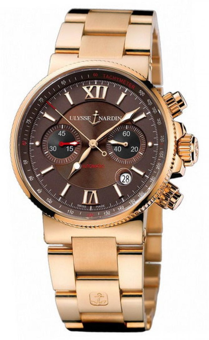 Достижения фирмы Ulysse Nardin в разработке морских хронометров были отмечены высочайшими наградами во всём мире. Компания получила более 4300 первых призов и 18 золотых медалей на всемирных и международных выставках. Морские хронометры Ulysse Nardin стояли на бортах более 50 флотов стран со всех пяти континентов. Механизм - автоматический, калибр UN-35 с запасом хода 42 часа. Корпус выполнен из розового золота 18К, 41мм в диаметре. Циферблат - коричневого цвета, гильошированый. Браслет из розового золота 18К, раскладная застежка.