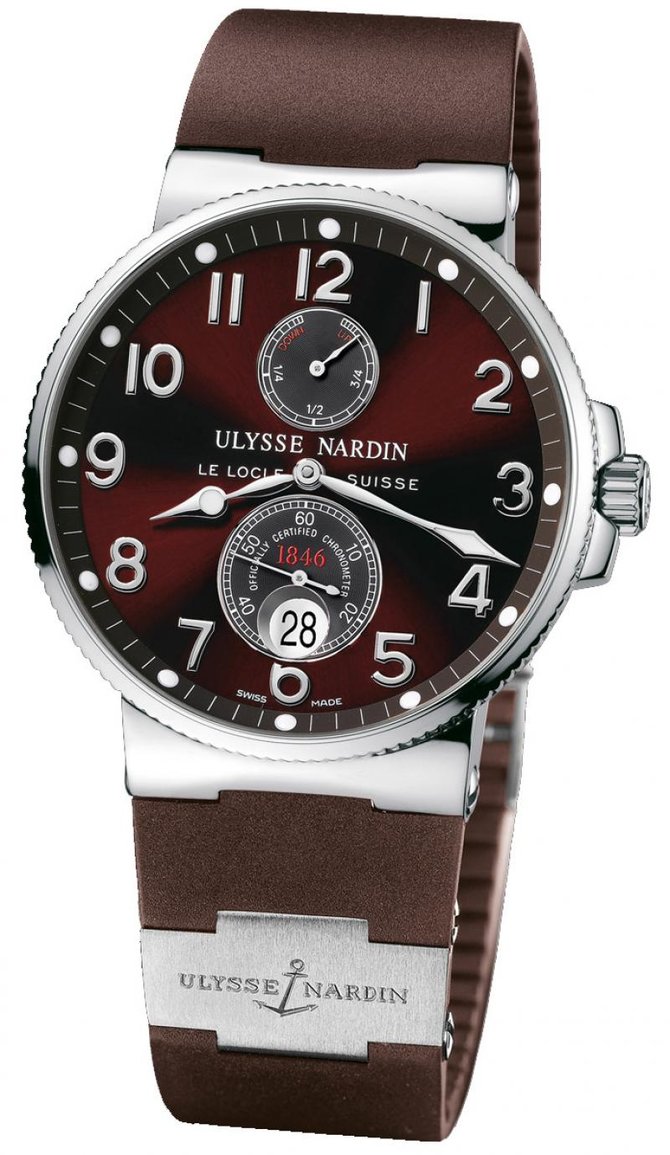 Ulysse Nardin с гордостью представляет Maxi Marine Chronometer 41mm, который дополняет коллекцию морских хронометров, существующую с 1846 года. Официально сертифицированный механизм (C.O.S.C) имеет запас хода 42 часа. Элегантный 41-миллиметровый корпус из стали, имеет индивидуальный номер и снабжен фиксируемой на резьбе заводной головкой. Циферблат - коричневого цвета, на котором расположены: индикатор запаса хода, маленькая секундная стрелка на увеличенном дополнительном циферблате и крупное окошко даты в положении «6» часов. Ремешок - каучуковый, коричневого цвета, раскладная застежка. Водонепроницаемость 200 метров.