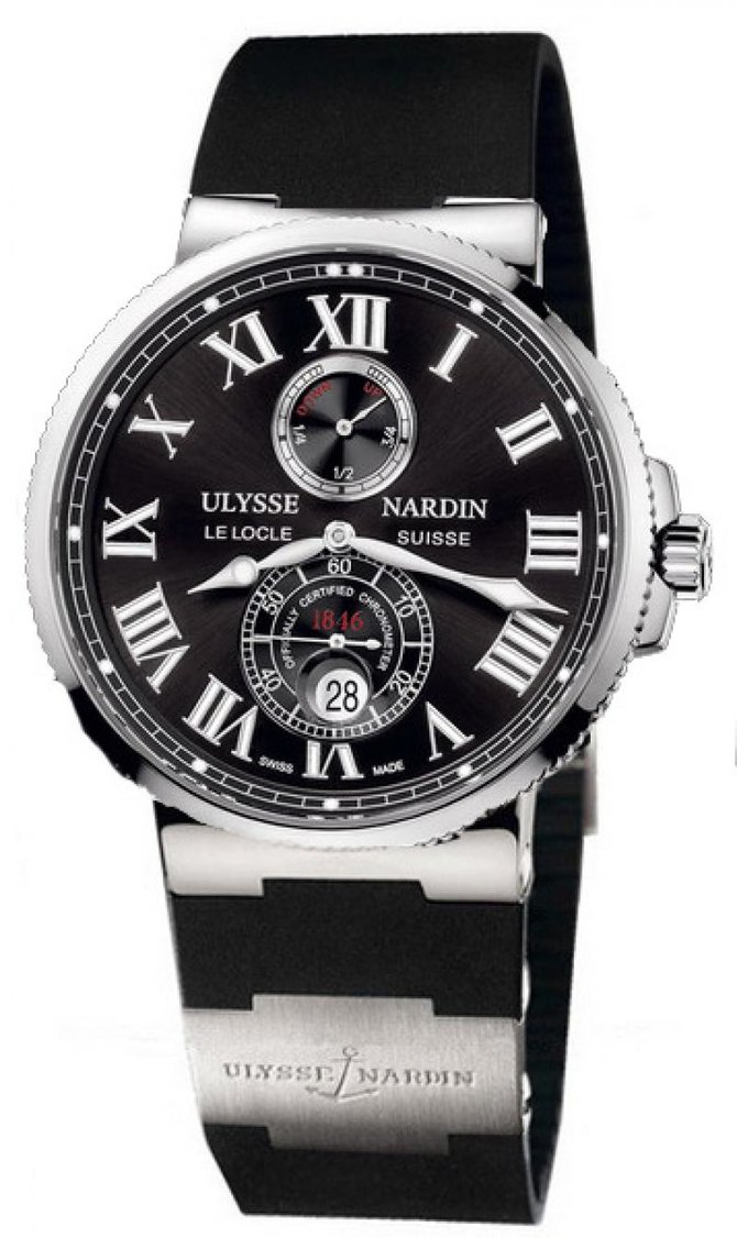 Ulysse Nardin с гордостью представляет Maxi Marine Chronometer 43 мм, который является дополнением к коллекции морских хронометров Maxi Marine. Официально сертифицированный механизм (C.O.S.C), калибр UN-26 с запасом хода 42 часа, имеет индикатор запаса хода увеличенный дополнительный циферблат с маленькой секундной стрелкой и большое окошко даты в положении «6» часов. Элегантный 43-миллиметровый корпус имеет индивидуальный номер и фиксируемую на резьбе заводную головку. Хронометр имеет прозрачную заднюю крышку, которая позволяет полюбоваться за работой механизма. Водостойкость 200 м. Эти часы выполнены из нержавеющей стали, на каучуковом ремешке черного цвета с титановой вставкой. Циферблат черного цвета, гильошированный.