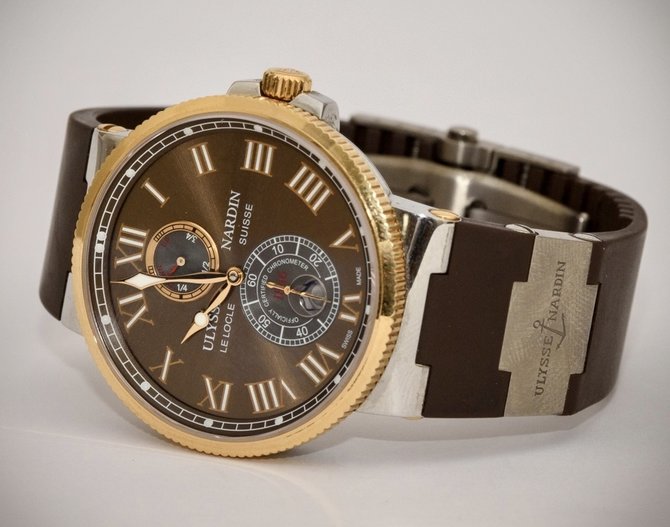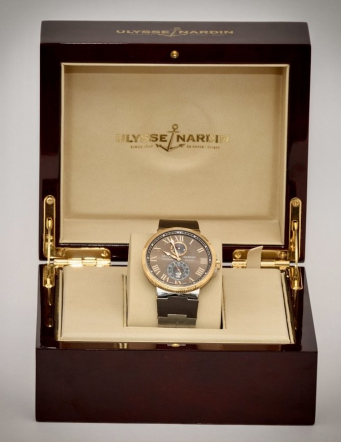 Ulysse Nardin с гордостью представляет Maxi Marine Chronometer 43 мм, который является дополнением к коллекции морских хронометров Maxi Marine. Официально сертифицированный механизм (C.O.S.C), калибр UN-26 с запасом хода 42 часа, имеет индикатор запаса хода увеличенный дополнительный циферблат с маленькой секундной стрелкой и большое окошко даты в положении «6» часов. Элегантный 43-миллиметровый корпус имеет индивидуальный номер и фиксируемую на резьбе заводную головку. Хронометр имеет прозрачную заднюю крышку, которая позволяет полюбоваться за работой механизма. Водостойкость 200 м. Эти часы выполнены из Розового золота 18К и нержавеющей стали, на каучуковом ремешке коричневого цвета с золотой вставкой, раскладная застежка. Циферблат коричневого цвета.