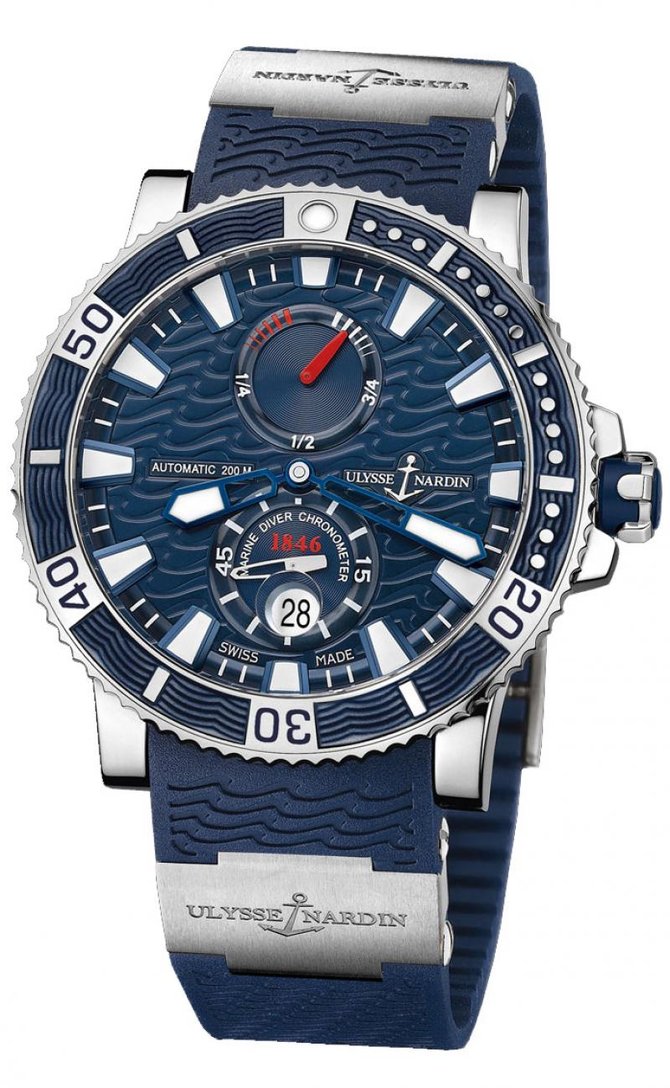 Новинка 2013 года. В этом году, компания Ulysse Nardin обновила свою коллекцию Maxi Marine Diver Titanium, добавив ярких красок синего океана. Часы созданы для решительных мужчин ведущих активный образ жизни. В новинке трудится автоматический механизм, калибр UN-26 с рутениевым цветным ротором и запасом хода 42 часа. Корпус комбинированный, выполнен из стали и титана, диаметром 45мм. Сапфировое стекло с антибликовым покрытием, устойчивое к царапинам. Завинчивающаяся заводная головка обеспечивает влагозащиту. Стрелки и часовые метки покрыты люминесцентным составом. Гильошированный в виде волн циферблат, синего цвета. Ремешок каучуковый, синего цвета с титановыми вставками, раскладная застежка.