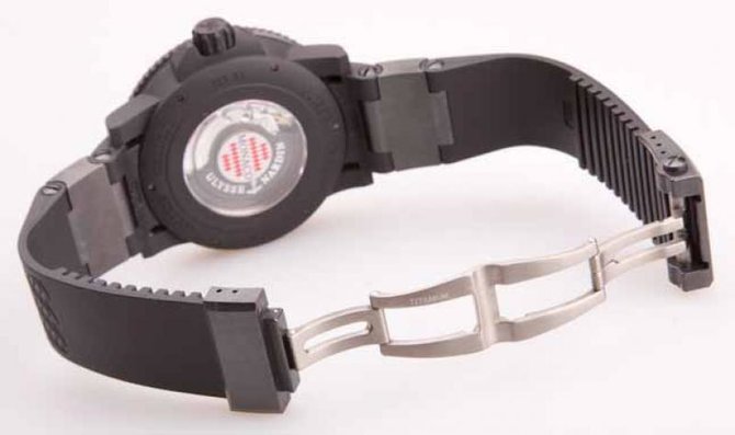 Часы выпускаются лимитированной и пронумерованной серией. Корпус часов Ulysse Nardin прорезинен каучуком 45,8 мм. каучуковый ремешок с черной керамической застежкой. Специально маркированный ротор.