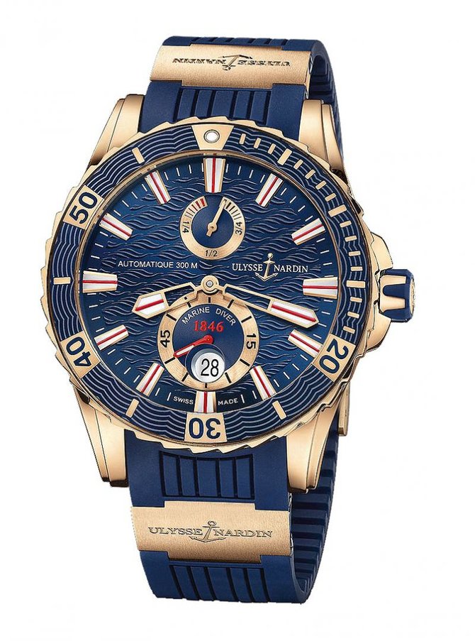 Новая модель, выпущенная в 2015 году часовой компанией класса "Люкс" Ulysse Nardin, была представлена на международной часовой выставке Basel 2015. Данные швейцарские часы - это новое пополнение модельного ряда Maxi Marine Diver. Спортивные часы выполнены в корпусе из розового золота 18К. На корпусе диаметром 44 мм расположен вращающийся в одном направлении безель. На циферблате, украшенном узорами в виде волн, расположены люминесцентные стрелки. Ремешок каучуковый, синего цвета. Часовой механизм с автоподзаводом, получивший официальный сертификат хронометра (C.O.S.C), снабжен индикатором запаса хода и отдельно вынесенным малым циферблатом секундной стрелки. Водонепроницаемость - 300 м. Хронометрия, о которой заговорили еще в начале XVIII века, незаменима в условиях морской навигации. Именно она сделала наручные часы показателем высокого статуса человека.